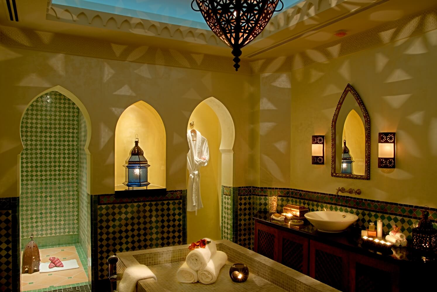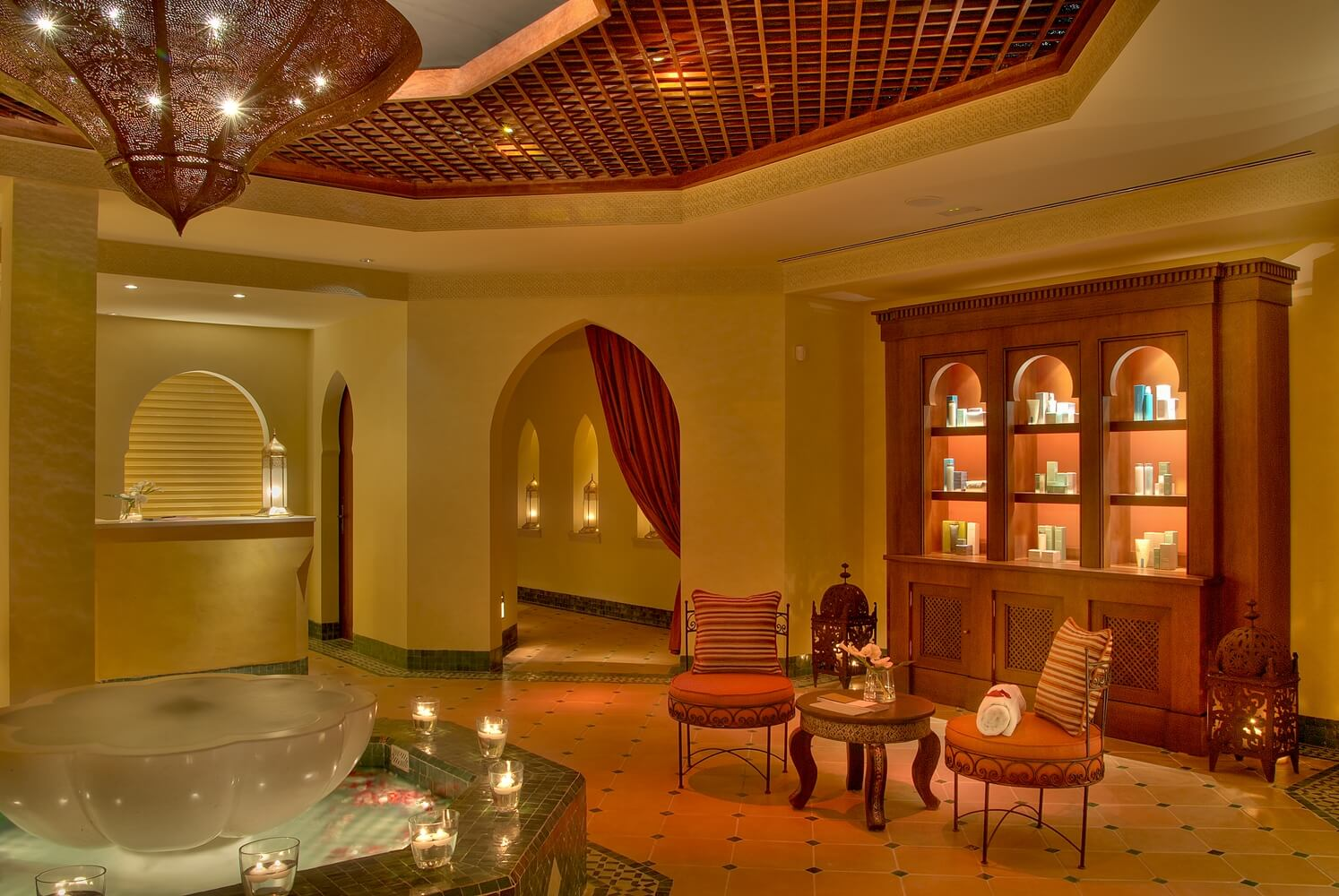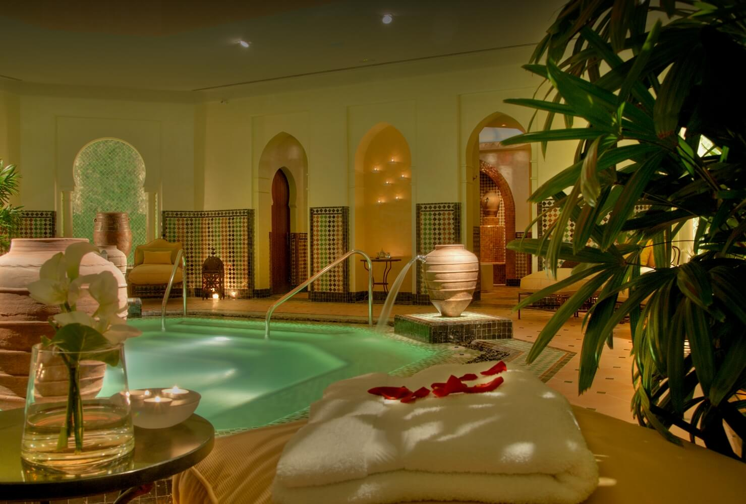 Completo centro de bienestar de 1.500 m 2 que incluye gimnasio, zona de aguas e hidroterapia con sauna, baño de vapor aromático, Hammam, duchas de hidromasaje y piscina terapéutica con chorros subacuáticos, 8 cabinas de tratamientos, salón de belleza y un área de descanso donde degustar un té, todo ello con un acogedor estilo andalusí.