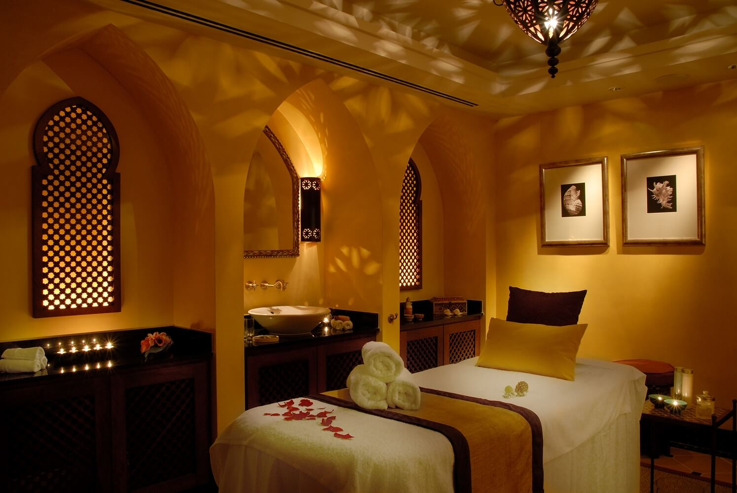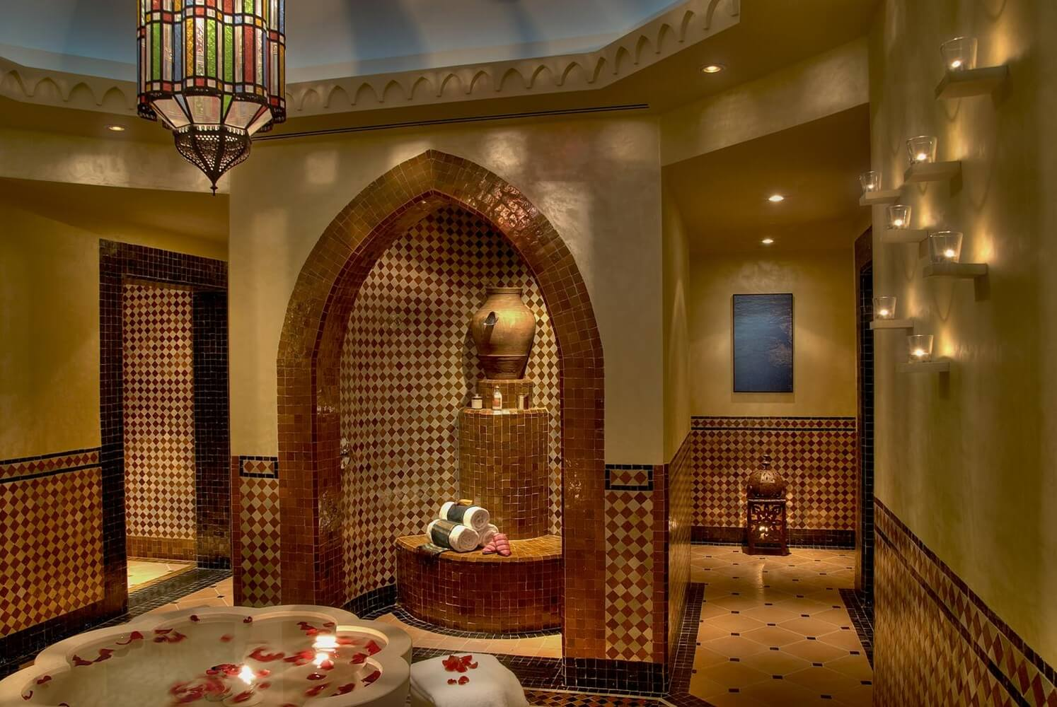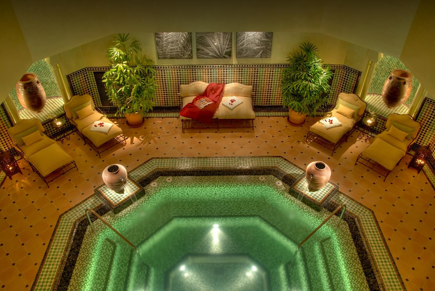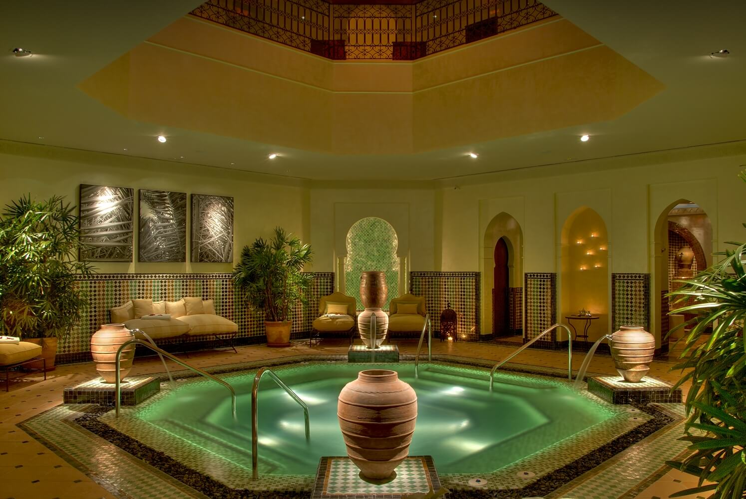 Completo centro de bienestar de 1.500 m 2 que incluye gimnasio, zona de aguas e hidroterapia con sauna, baño de vapor aromático, Hammam, duchas de hidromasaje y piscina terapéutica con chorros subacuáticos, 8 cabinas de tratamientos, salón de belleza y un área de descanso donde degustar un té, todo ello con un acogedor estilo andalusí.