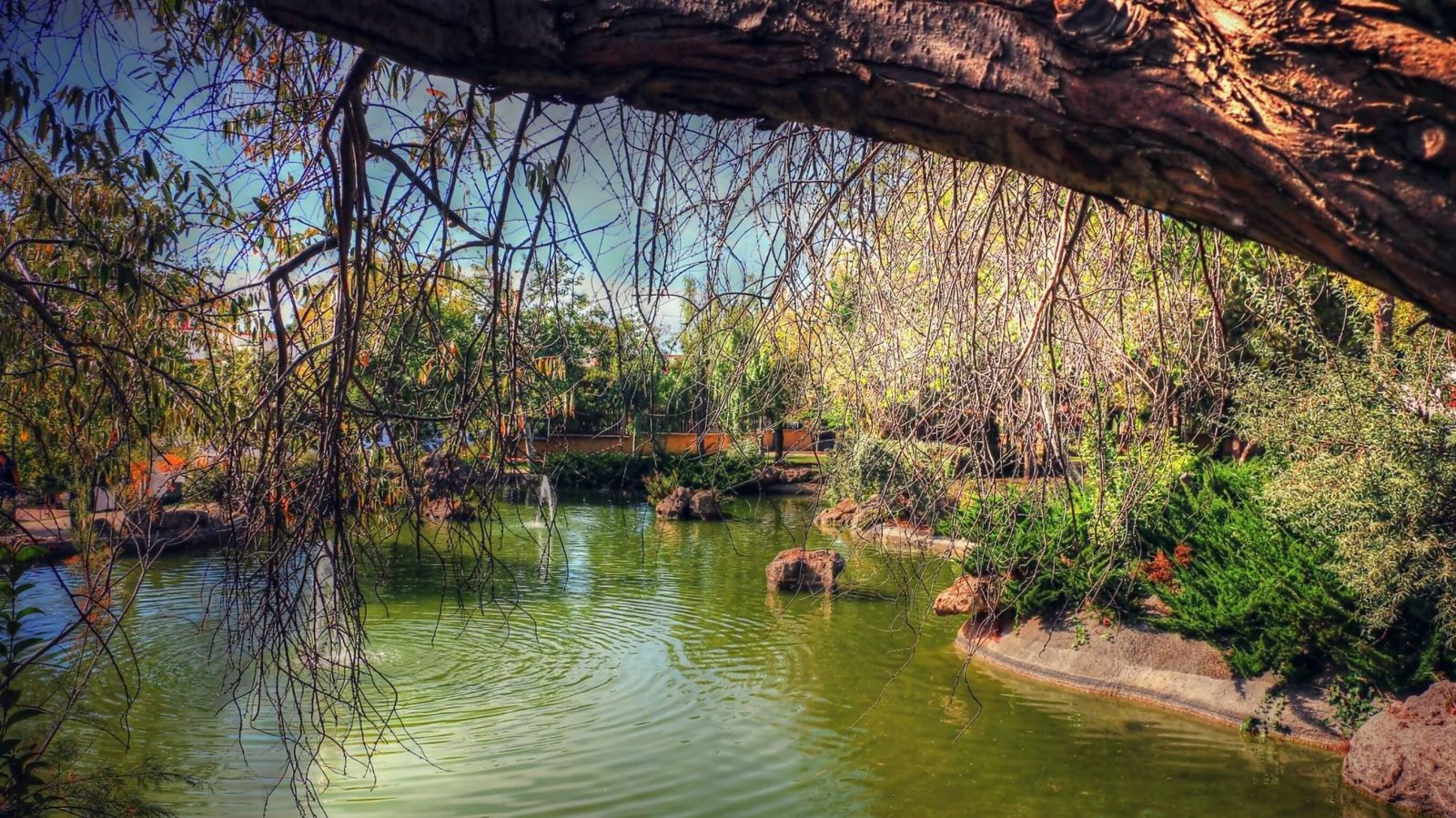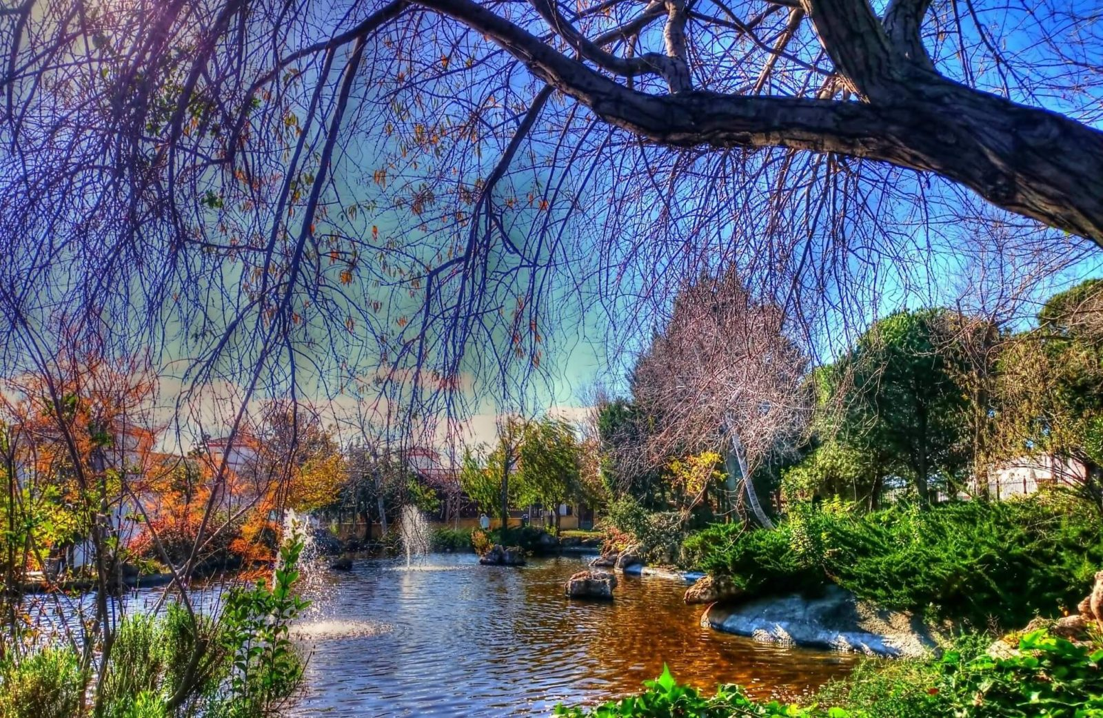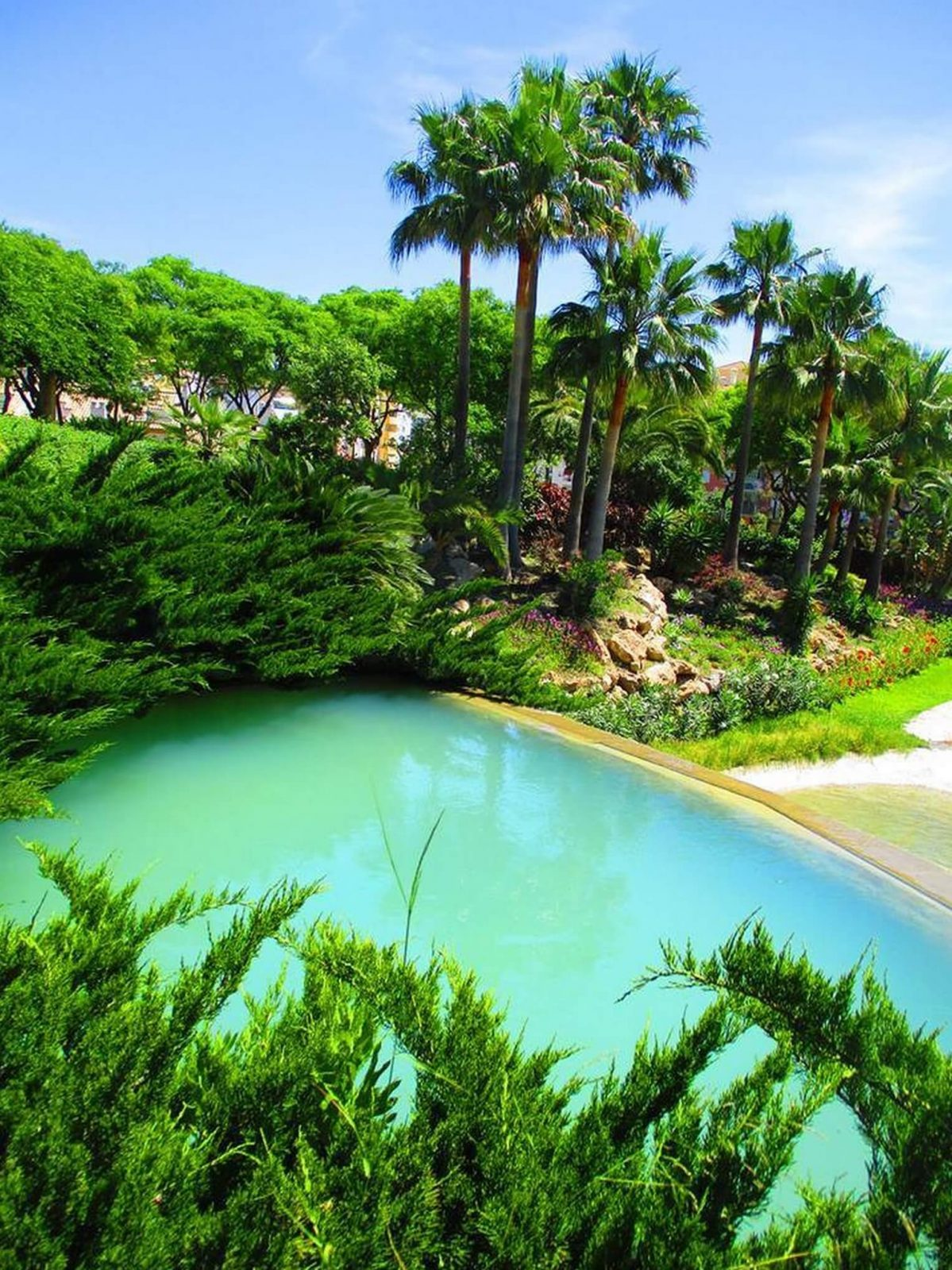 Impresionante lago-fuente con cascada y géiseres centrales de 770 m2 de lámina de agua en el corazón del parque más grande y de mayor variedad botánica de la ciudad